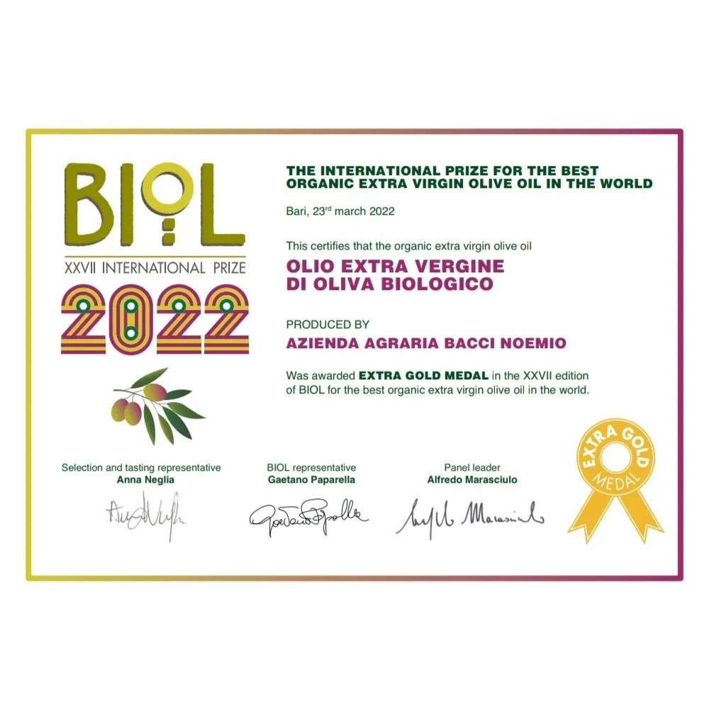 Biol 2022 - EXTRA GOLD MEDAL (category: Organic Monocultivar Moraiolo extra virgin olive oil);