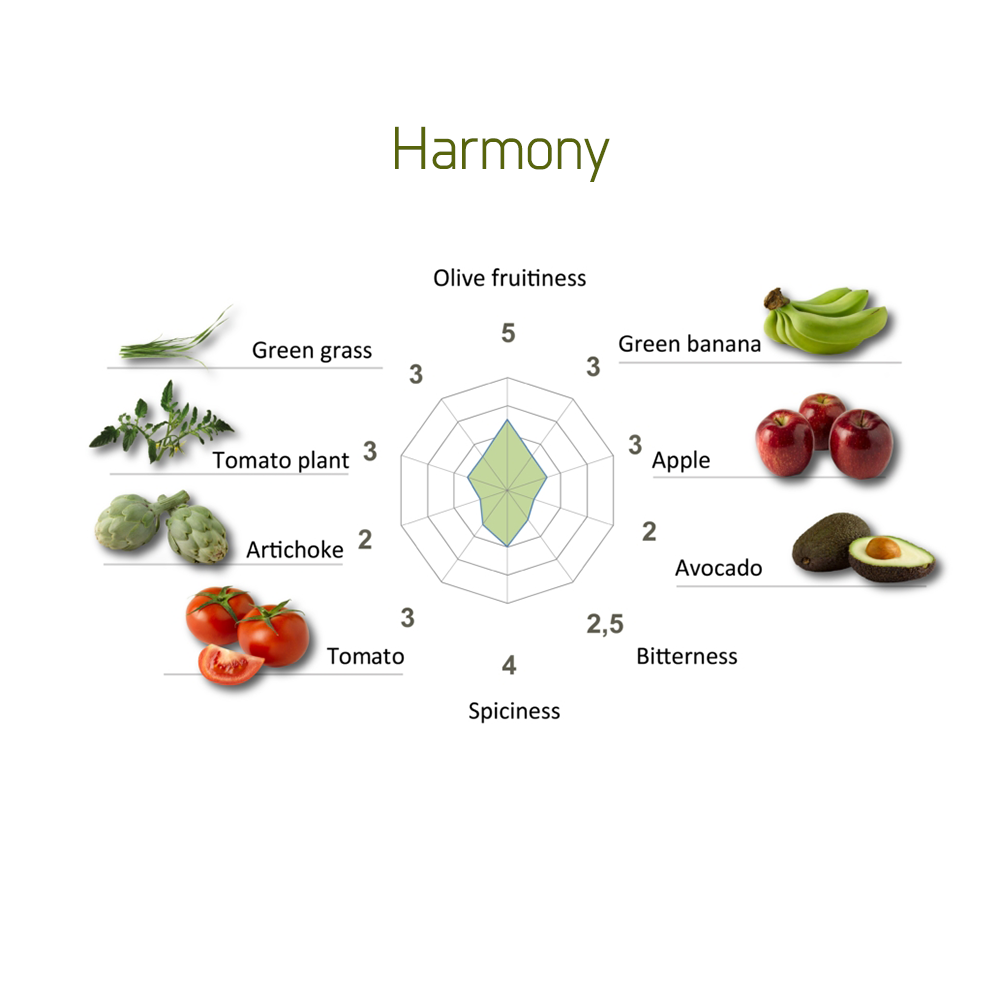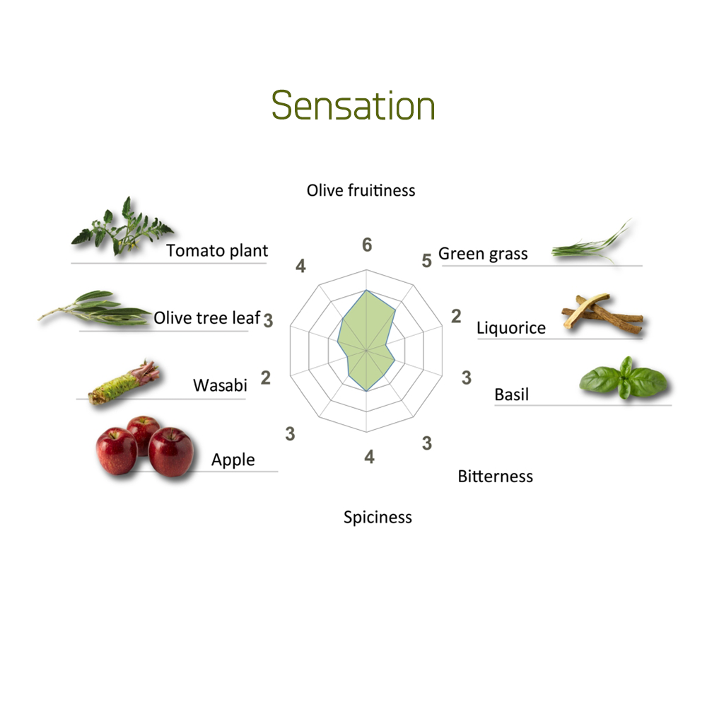 Pleasant and silky, it is an exquisite complement to many dishes. With a fine and soft structure, it is an ideal extra virgin for those who pursue suggestive nuances such as green grass and tomato, in balance with the fruity notes of green banana, apple or avocado.