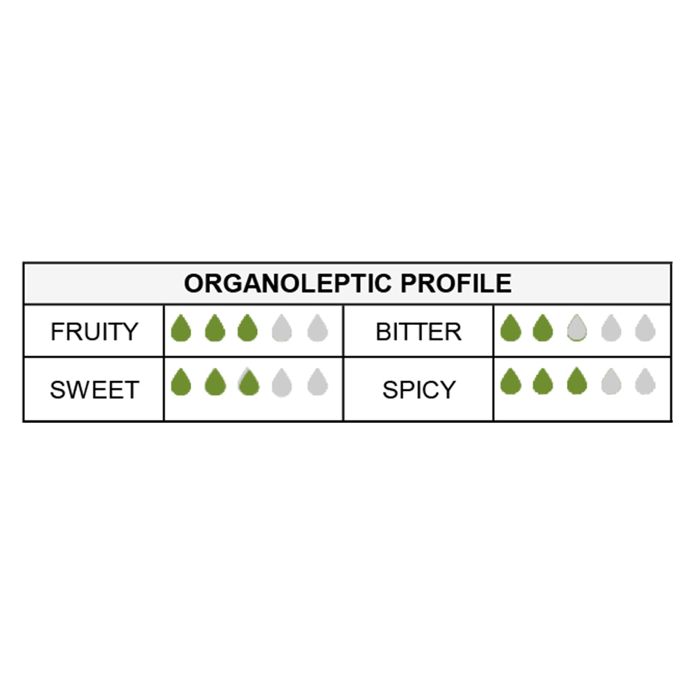 Aroma: Intensely fruity, green, and vibrant, with a bold, pungent, and spicy character. Well-defined bitter and spicy notes are excellently balanced.