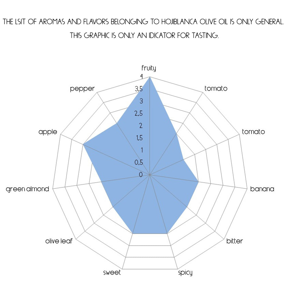 Hojiblanca is the third most popular variety in Spain in terms of corp area. The provinces of Andalusia play a key role in Hojoblnca olive cultivation. Hojiblanca olives are used both for the production of table olives and olive oil. Olive Oil made from the Hojiblanca variety has a pleasant aroma of cut grass, fresh fruit with hints of almond, tomato and apple. The Olive Oil made from the Hojiblanca variety has intense fruitiness, slightly bitter, sweet and spicy.