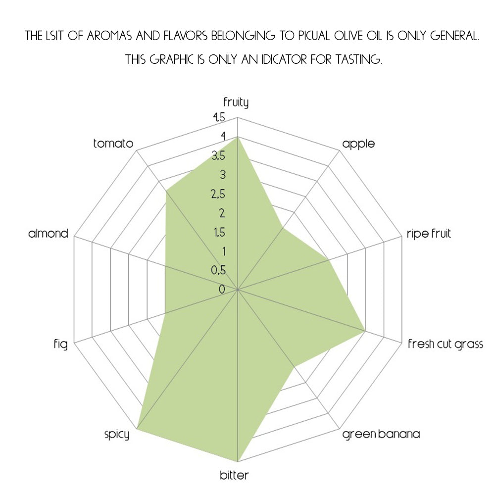 The Picual olives are one of the most cultivated varieties of Spain. The olive oil extracted from Picual olives has a medium aromatic profile with pleasant notes of tomato, fig tree, olive leaf, and freshly cut grass. Its oil is also well known for its strong bitter- and spiciness. It is often mixed with other oil to soften its bitterness and enhance its fruity flavor. Thanks to its stability the olive oil extracted from Picual olive has a long shelf life and makes it stable for cooking or frying.