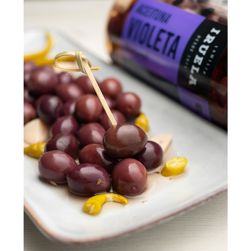 Delicious 'Violeta' olives, perfectly seasoned with garlic and piparras to enhance their flavor, make for a tasty snack that complements meats and cheeses excellently. With their fantastic taste and texture, they are an ideal addition to any gathering or meal. Just keep in mind, they have a bit of saltiness.