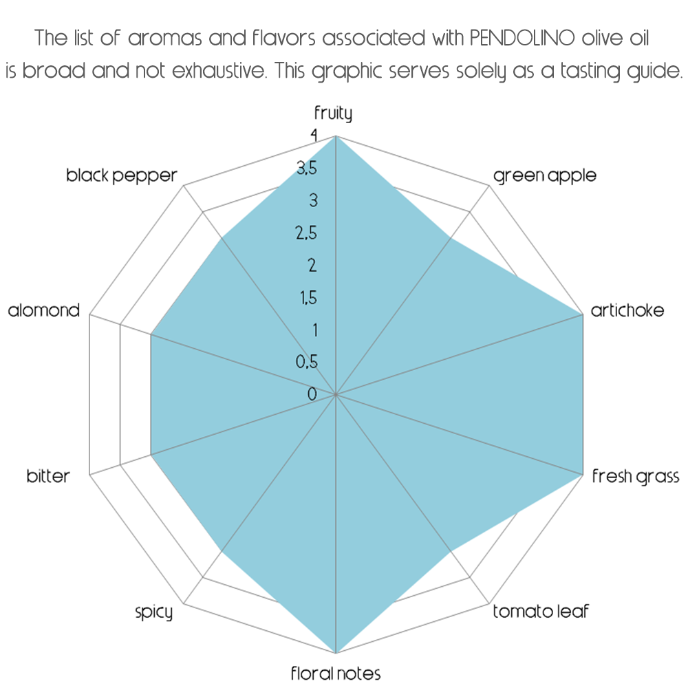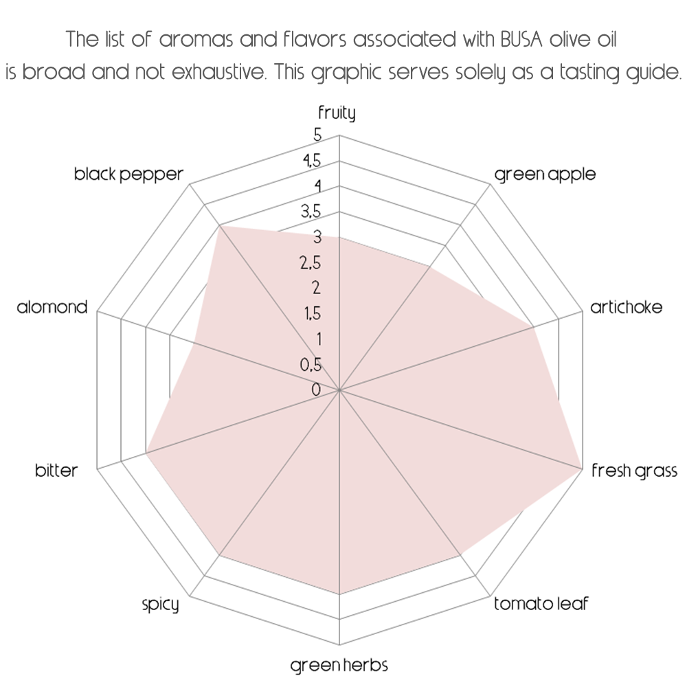 Blend, whose label is inspired by a selection of varieties grown in our olive grove and by the terroir - the red soil of Istria and the sea - offers a welcoming, fresh, medium-intensity green fruity aroma with a hint of almond, complemented by notes of apple and green banana, accompanied by a touch of aromatic herbs. The initial slightly sweet flavor gives way to vibrant, harmonious, and enveloping bitter and spicy sensations, with hints of thistle and chili emerging.