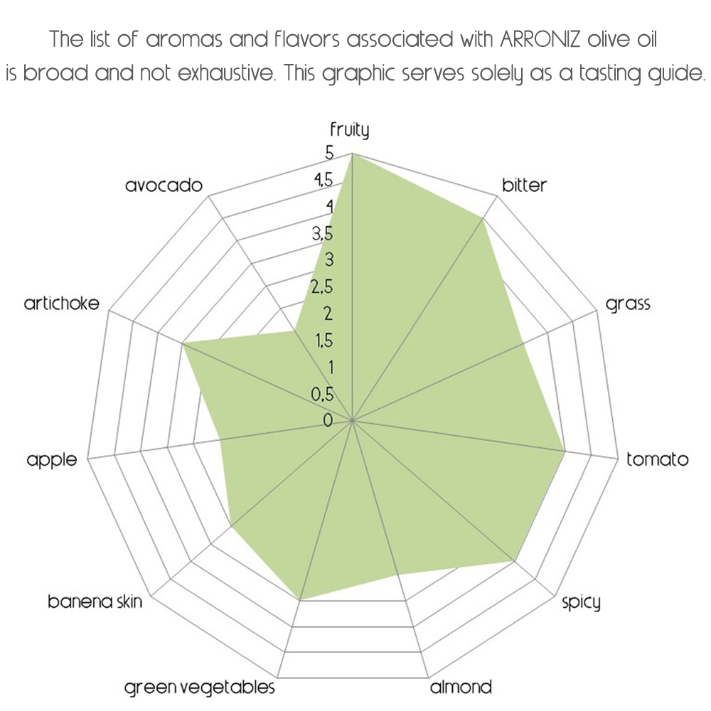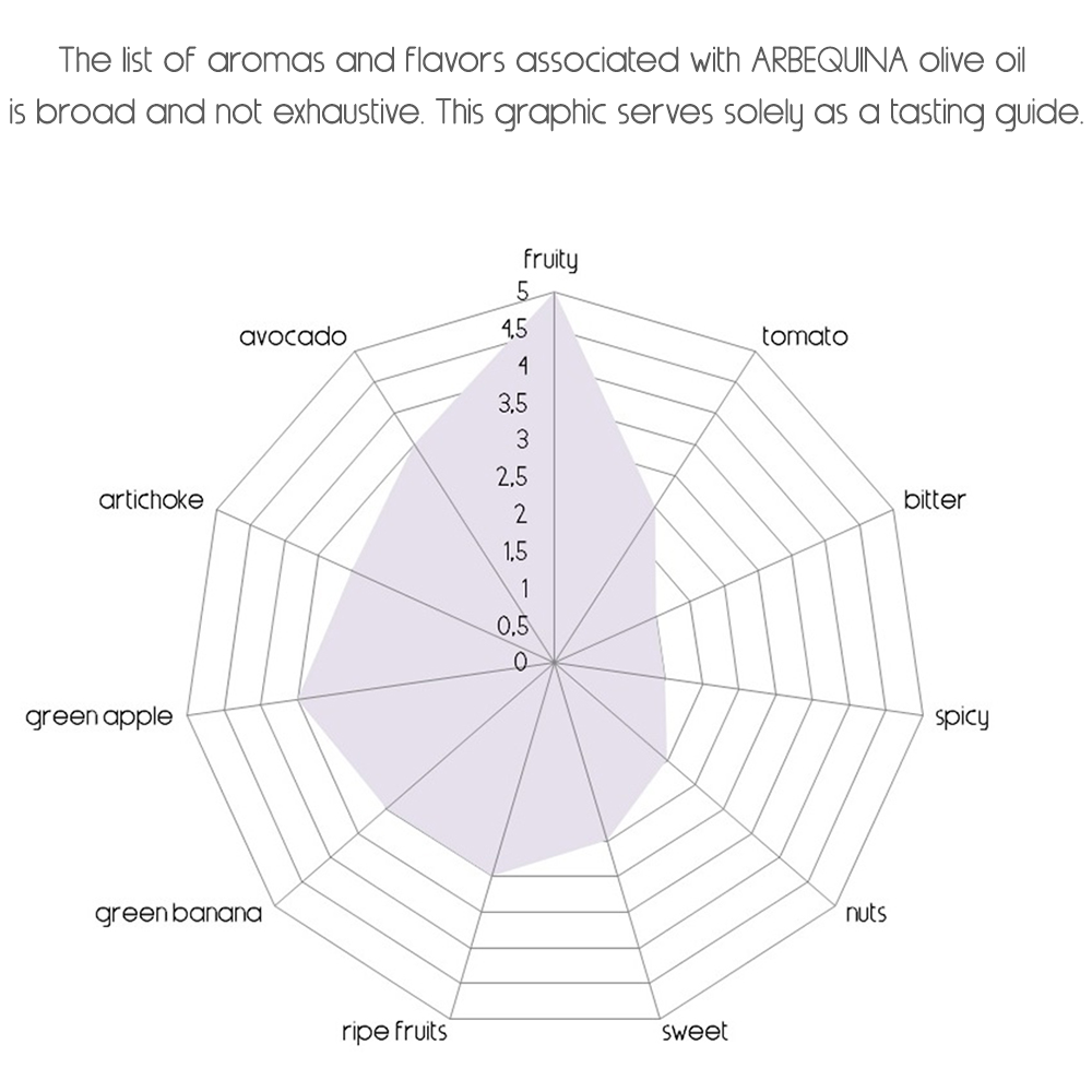 Olive oil made from the Arbequina variety is aromatic, sweet and fruity with a little bitterness. Typical aromas: green grass, tomato, apple, banana, ripe fruit. Usually, oils made from the Arbequina olives have a low oxidation resistance. Producers mix the Arbequina olive oil with other olive oils to increase the stability in terms of aroma, body and resistance to oxidation.