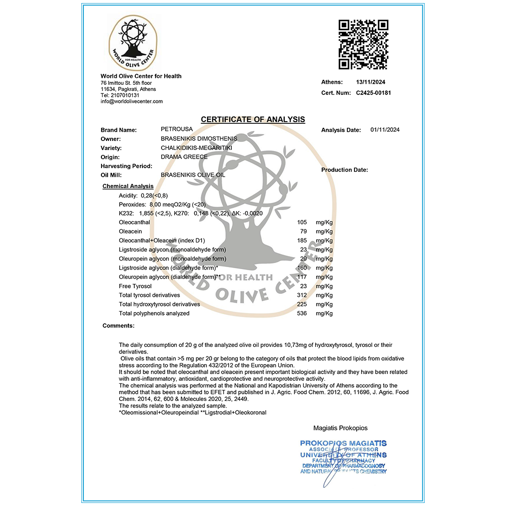 Petrousa Extra Virgin Olive Oil is Health Claim certified (according to EU Regulation No. 432/2012) and contains over 500mg/kg of polyphenols, which help protect blood lipids from oxidative stress. The positive effect occurs with a daily intake of 20g.
