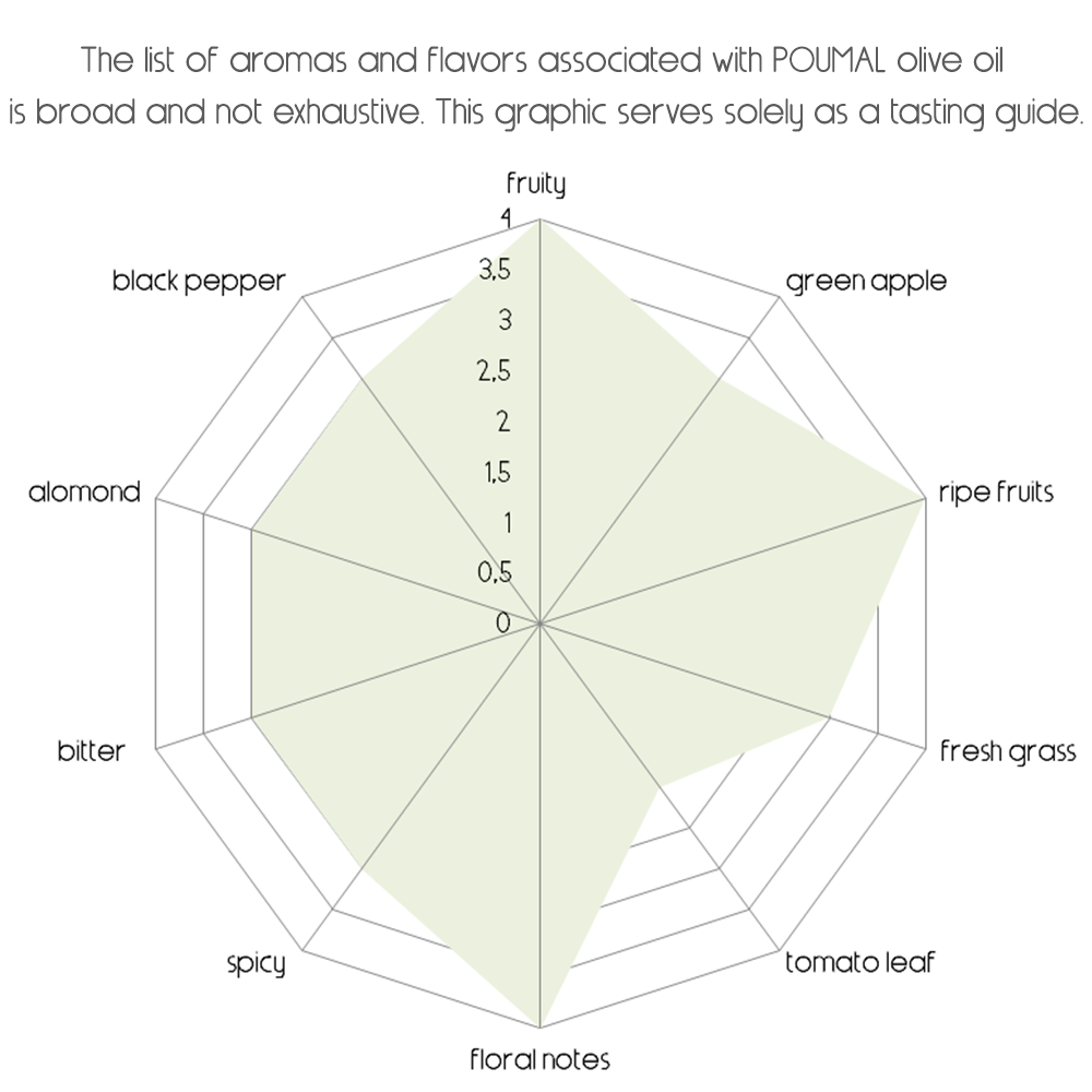 The Poumal olive variety originates from the Mediterranean region. It produces high-quality olive oil with a rich, fruity flavor, subtle peppery undertones, and a balanced bitterness, complemented by a fragrant aroma.